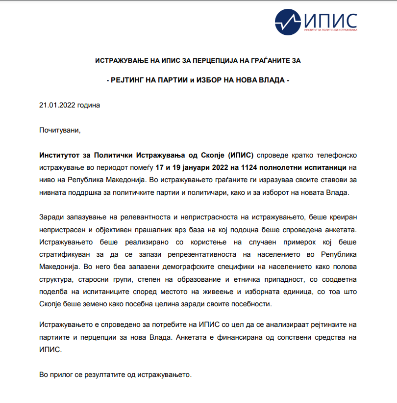 The Institute for Political Research – Skopje is a research agency based in Skopje. The institute’s strategic goal is the advancement of political, legal and economic processes in Macedonia, as well as perceptions of the development of political culture through the implementation of scientific research projects, but also through the organization of workshops, debates and conferences. The institute is dedicated to conducting research and preparing analyzes for the Macedonian society and the situation in the region, as well as for public promotion of opinions and recommendations that are formulated based on the results of the research. Such an approach allows real insight into the current socio-economic and political situation. The institute is a think-tank and action-tank institution, that is, we are focused on both scientific research and policy making at the same time.